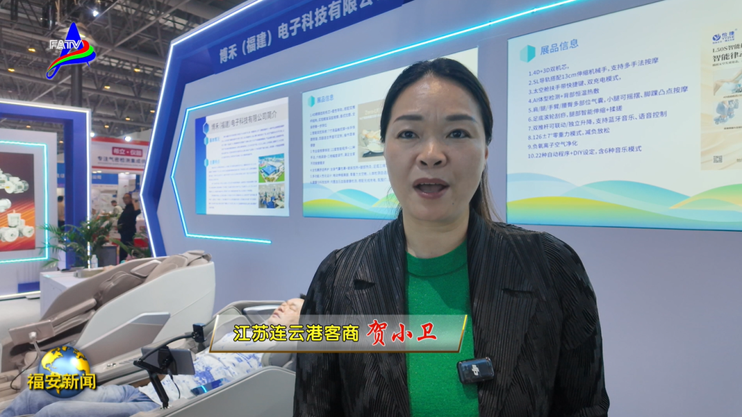 博禾(福建)电子科技有限公司业务跟单 刘晓丹:我们这次带来了两款热销产品——瑞德玛5289和R60。特别是R60,它采用柔性导轨,4D机芯,全触摸液晶屏,超级泰式拉伸,自动揉捏美腿设计,健康检测功能,全身气囊包裹。现场很多客商都在排队体验,目前我们已经接到了大量意向订单。