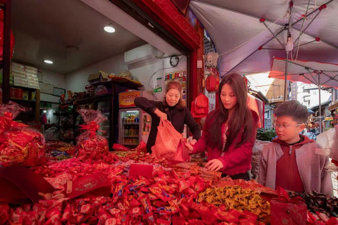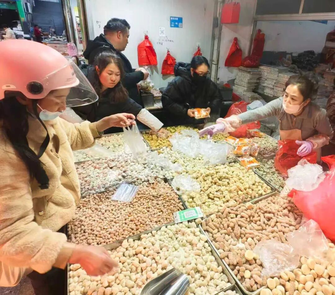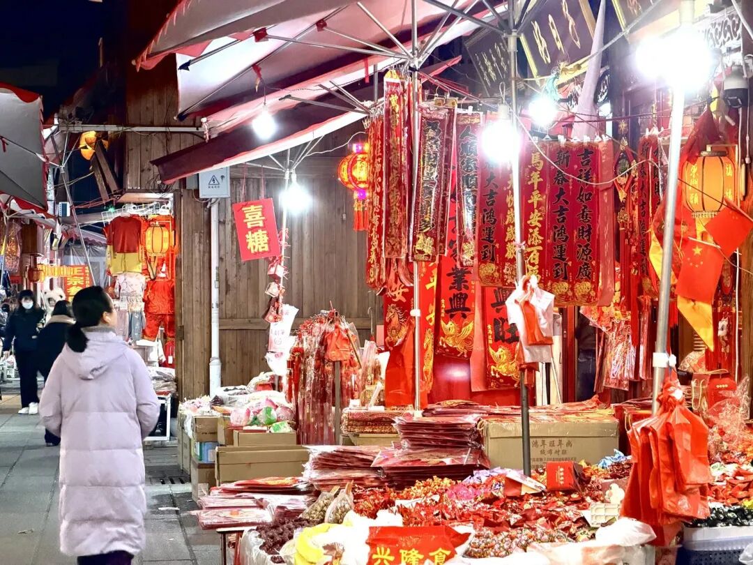 年货市场,一个个摊位被喜庆的红灯笼装点得格外醒目,马年卡通挂件、寓意吉祥的对联、红彤彤的福字、色彩艳丽的年画等年俗饰品整齐摆放,市民们驻足挑选,指尖划过喜庆的红纸,将新春的期许细细收藏。