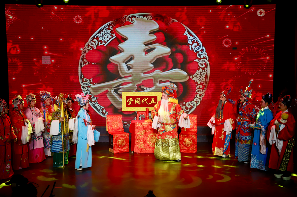 演出在合唱《我和我的祖国》中拉开序幕。第一篇章“家国梦·赤子心”中,舞蹈《共圆中国梦》、沙家浜选段《智斗》等精彩节目轮番上演,抒发了对祖国母亲的深切热爱与对民族复兴的坚定信心;第二篇章“新城韵·乡土情”聚焦福安发展变迁,以情景表演《老俩口逛新城》、旗袍情景秀《又见江南雨》、三句半《福安新貌唱开怀》、器乐小合奏《迎春曲》等经典曲目,将福安城市建设成效融入文艺表演,生动描绘出五福新城的幸福画卷;第三篇章“桑榆乐·夕阳红”则传递出市老年大学学员的温情与活力。男女小组唱《回声嘹亮》歌声嘹亮、情谊绵长。朗诵《情系同窗 爱伴朝夕》以真挚的情感,歌颂祖国、赞美学校,道出了同窗相伴、朝夕相处的深厚情谊。最后,福安本土文化瑰宝平讲戏《五代同堂》压轴登场,以传统艺术形式诠释了家庭和睦、社会和谐的美好图景,将演出推向高潮。