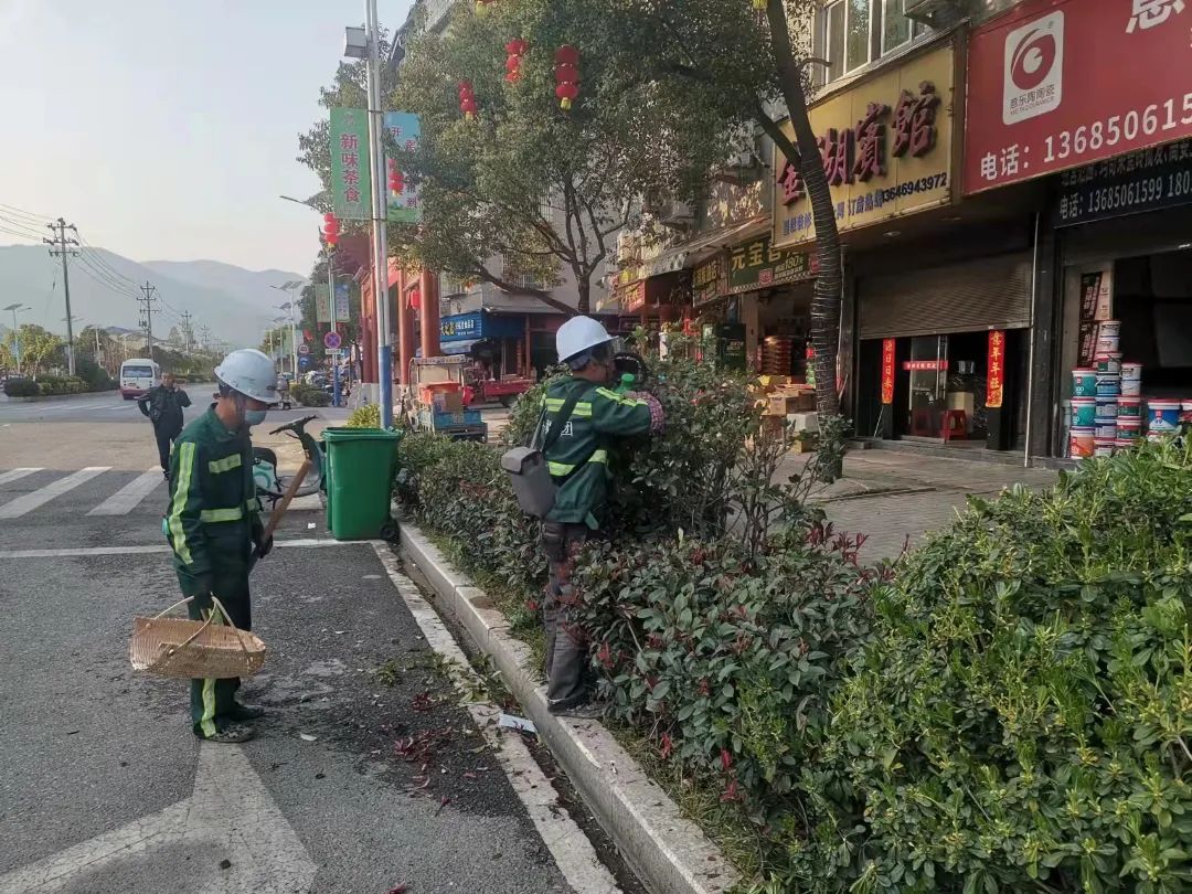 在金湖路、茶王街、富春茶城、岩湖三角坪地块及沿线更换行道树17株,种植时令花2160株、竹篱150米、种植地被植物165平方米、补植灌木球450株、新建绿化隔离栏杆110米,新建草皮围挡60米,清理绿化带及树池杂草杂物195平方米;对岩湖加油站对面的塌方处采用仿真绿植围挡42.5米,周边环境得到明显改善。