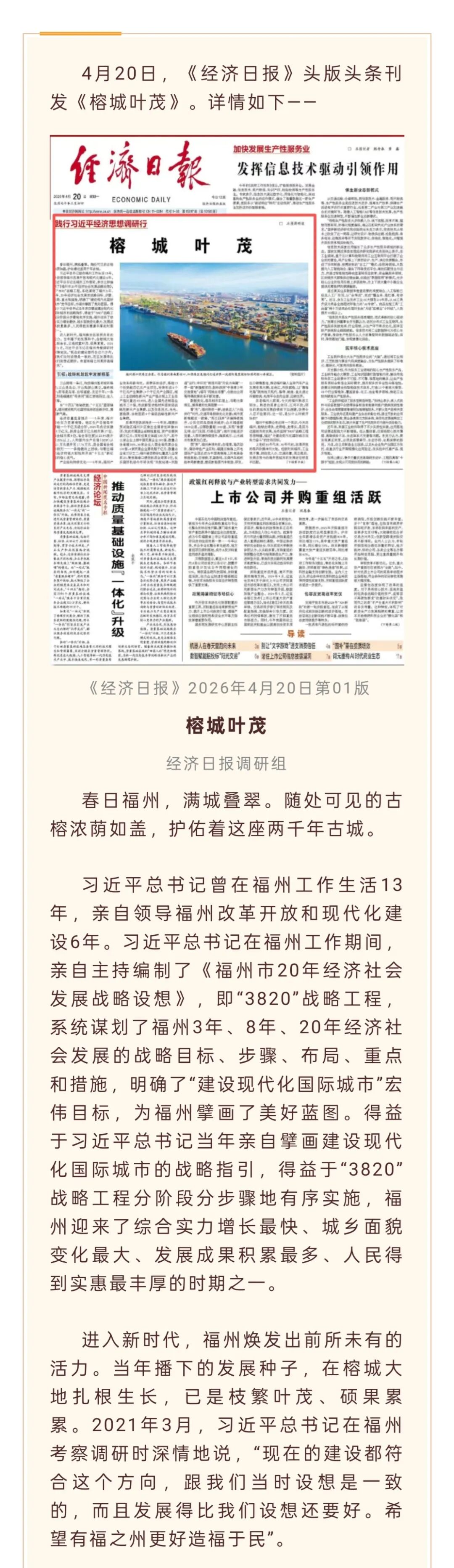 央媒看福建丨经济日报头版头条聚焦:榕城叶茂