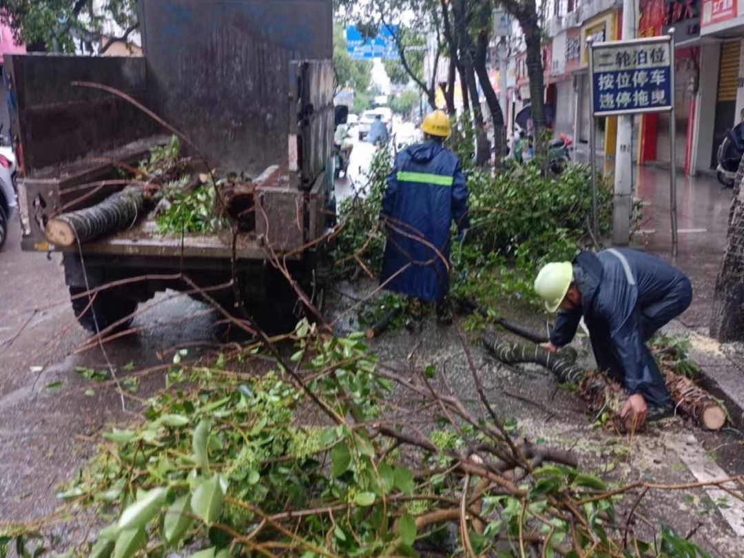 这棵倒伏树木历经40分钟才处理完毕,又来一起树木倒伏险情。原来慢道四期有1棵羊蹄甲树倒伏了……该树木具备扶正条件,园林管护工人先将多余树枝截“枝”,以避免枝叶积水过多,而再次压垮树木,且可减小风阻。数名工人合力把树木扶正并重新栽回挖好的树池中,然后回填余土,踩平、压实,采用“井”字支撑的方式对树木进行加固。发稿时,浅水湾、溪北洋新区、富春大道、新泰路的树木倒伏、树枝折断的险情频传……郑绍表示,园林管护人员正分头赶往事发地段进行紧急处置。他还介绍,为确保能够在最短时间内将险情处置到位,该公司按照工作预案已事先采购大量储备物资,支撑木300根、雨衣50套、雨靴50双,抽水泵2台、油锯3台、电锯5台、高枝剪25把、楼梯4部。由于长时间降水,行道树根部蓄水趋于饱和,一些根部树木不发达,但树冠茂盛的树木和病灾树容易在狂风中倒伏或折断,大家尽量要靠人行道的内侧行走,万一遇到树木倒伏,也会有周边建筑物或构筑物做支撑;需要临时停车的驾驶员,一定要选择相对安全的区域,尽量避免把车辆停靠在行道树底下。