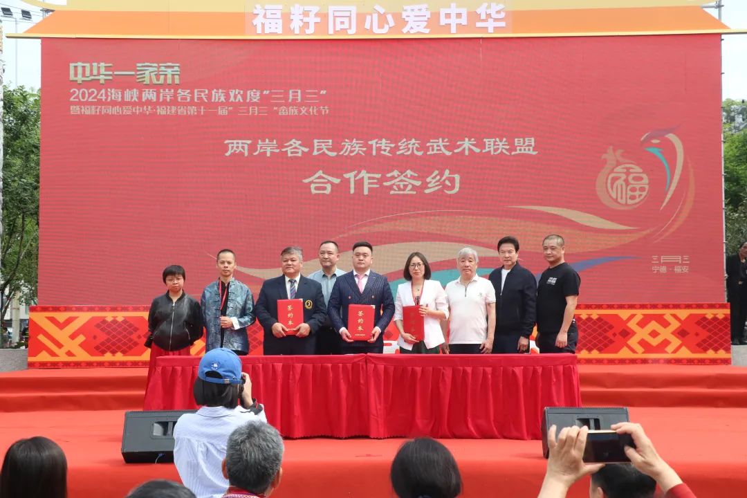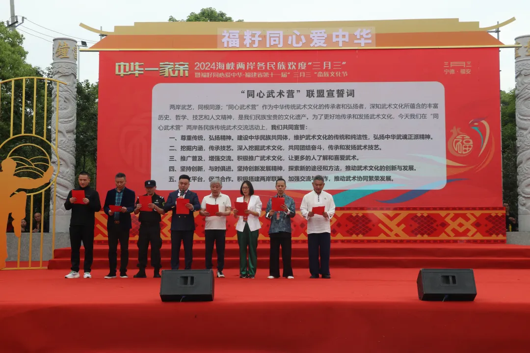 活动在精彩的南少林寺《韦驮拳》中拉开序幕。福建省青年武术协会会长裴仁彬和台湾武术协会秘书长刘慧分别发言并与协会代表进行“同心武术营”联盟宣誓。随后,在两岸嘉宾的见证下,福建省青年武术协会、台湾武术协会、中华武术散打搏击协会共同签署《两岸各民族传统武术联盟合作》,致力促进民族乡村振兴,推动两岸武术运动相融发展。