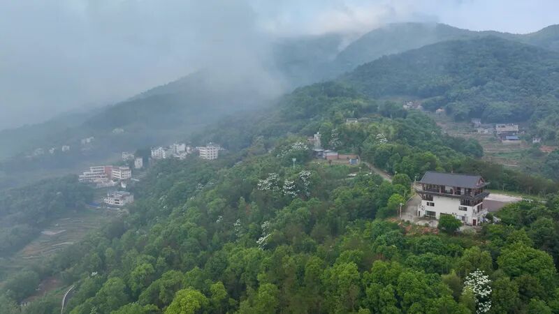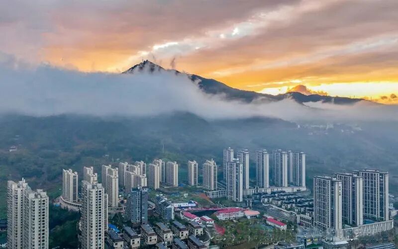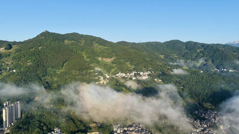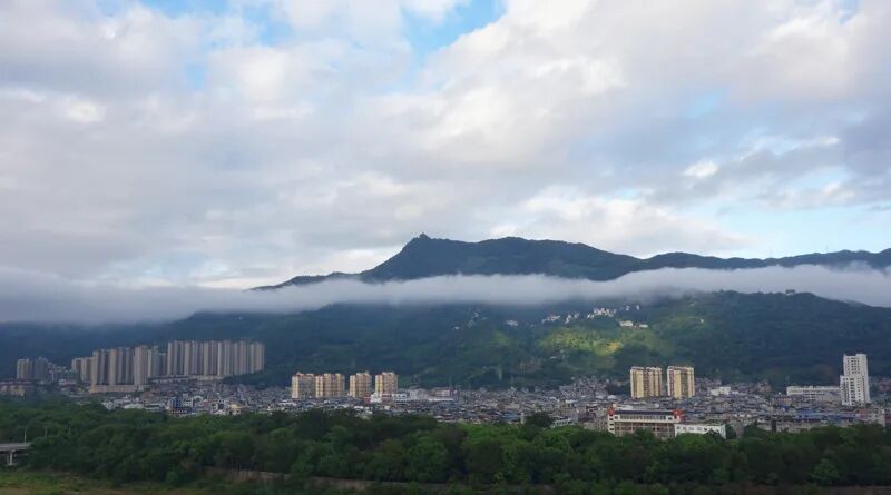 仙岫山,明朝县志记载叫做仙岭,顶峰叫做仙岭鼻,其上建有福安电视转播铁塔,福安人俗称电视塔。仙岭是韩阳盆地周围最高的山,县志中称其为“巨镇”。正是清明节气,春和景明,暖阳穿过云层,洒在仙岫山上,与漫山遍野的新绿,绘成一幅诗意清新的水墨画。仙岫晴云变化多端,有时雨后天晴,湿气上升遇冷凝结成一条云带,笼罩半山腰,远远望去,仙岩村畲族民居若隐若现,仿佛天宫里的琼楼玉宇 ;有时玫瑰色的云块在天空徐徐变幻成飞鸟、巨人、雄狮。“晴云轻漾,熏风无浪,开樽避暑争相向。”婀娜多姿的“仙岫晴云”幻化成的绮丽景致美不胜收。