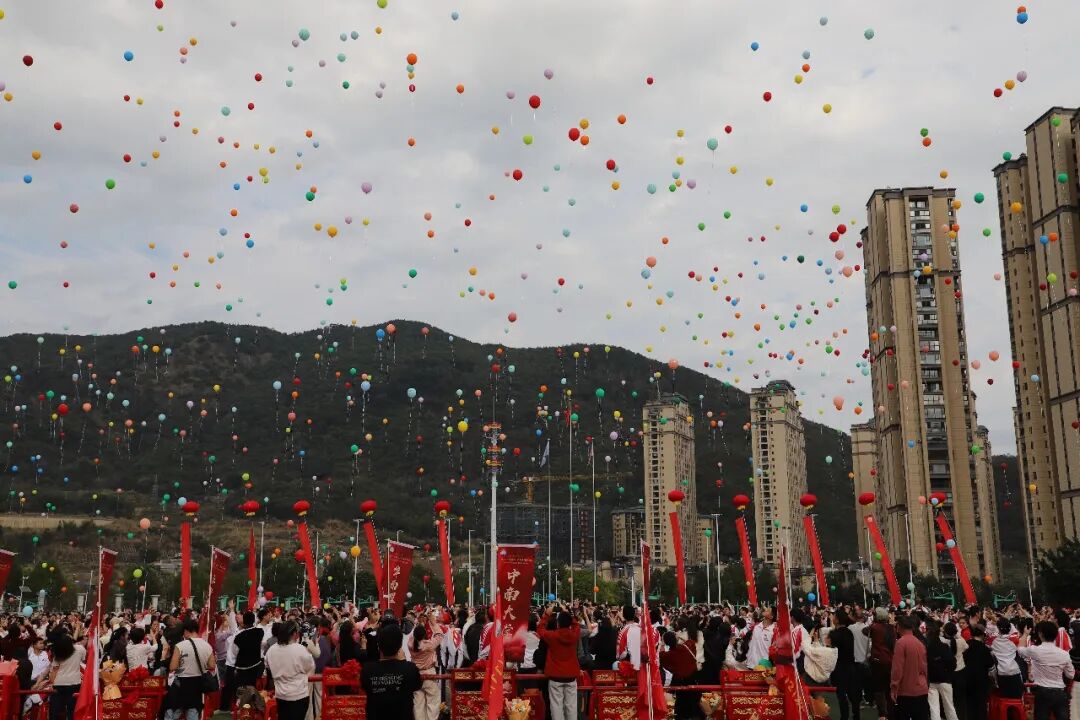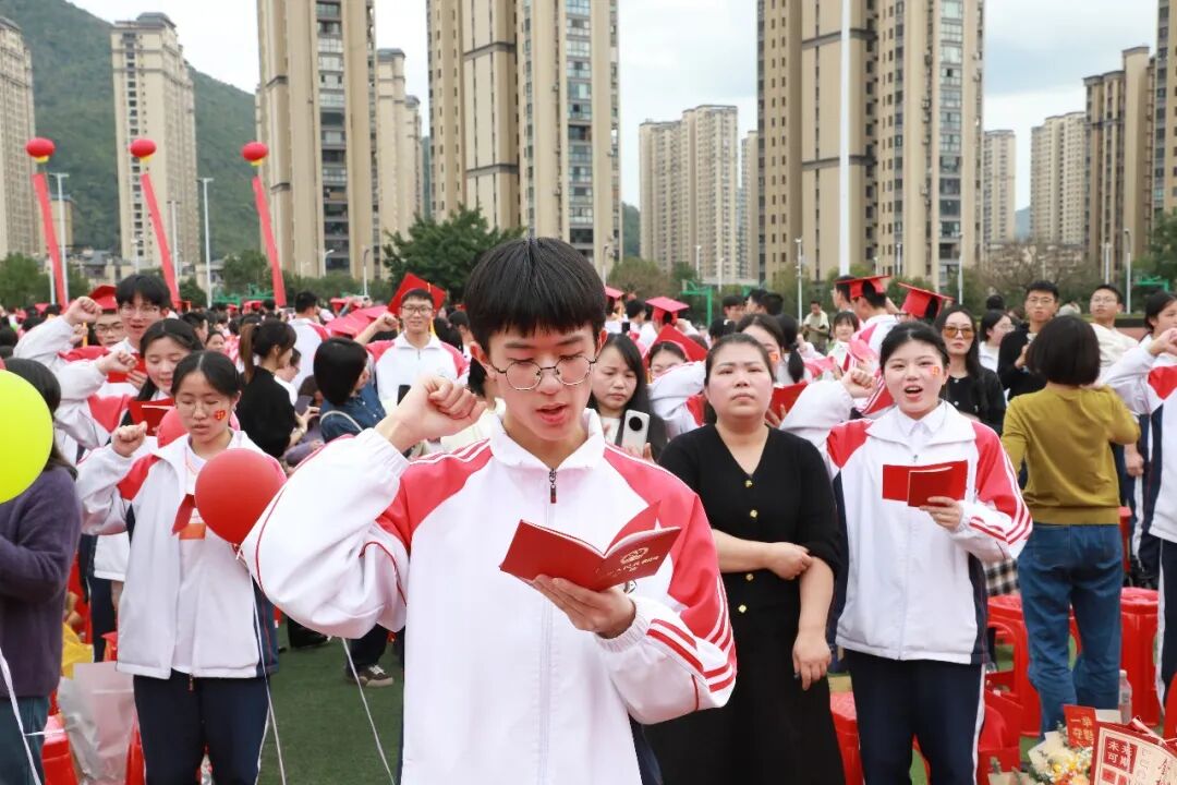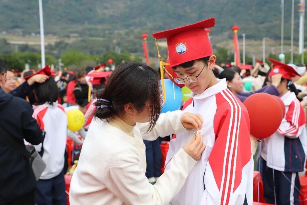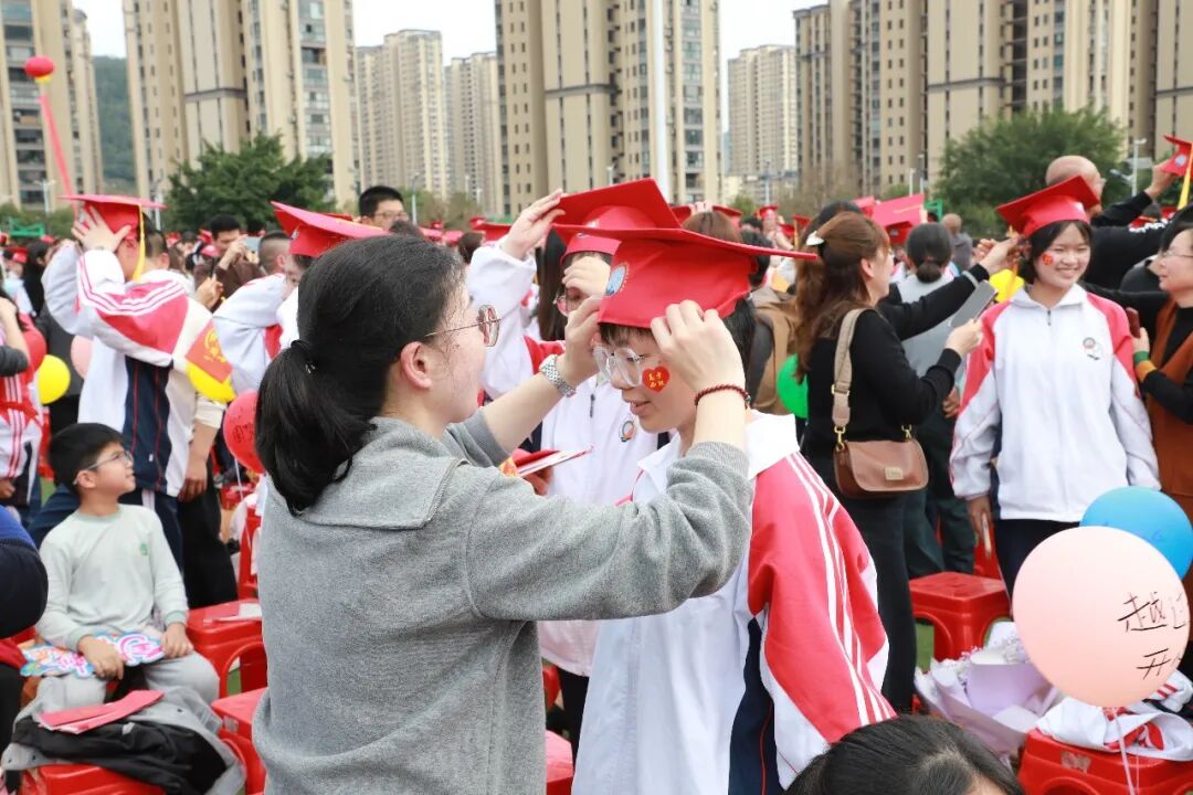 在升国旗、奏唱国歌仪式后,“正冠拨穗”环节开启,家长们为孩子佩戴成人纪念章、成人帽;在感恩环节,学子们向父母呈递“给家长的一封信”,并以传统拱手礼三鞠躬。而后,全体同学左手持宪法读本于胸前,右手高举,面对国旗庄严宣誓;在“投递心愿、放飞梦想”环节,同学们心愿随着冉冉升空的气球飞向更远的远方。