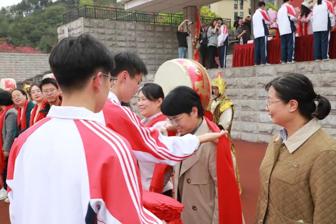 在“鱼跃龙门”环节,教师代表高举旗帜引领队伍,学生们依次穿过“成人门”“状元门”,老师、家长们在与学子们击掌鼓励。“在这个特殊的日子里,我既激动又平静。激动的是同学们马上就要踏入高考的‘战场’,平静的是,同学们认真备考的态度,让我坚信在不久的将来,他们一定能落笔生花、未来可期。”高三年级语文老师陈淑慧表示。