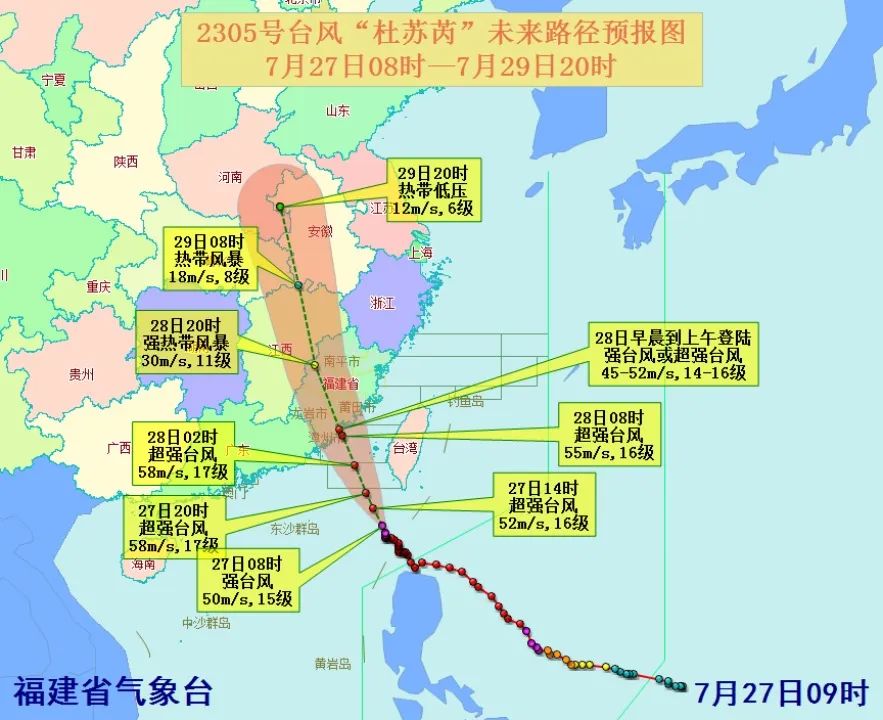 预计“杜苏芮”将以每小时15公里左右的速度向西北方向移动,逐渐向我省南部沿海靠近,强度有所增强,最大可能于28日早晨到上午在我省晋江至东山一带沿海登陆,登陆时中心附近最大风力为14~16级(强台风级或超强台风级)。