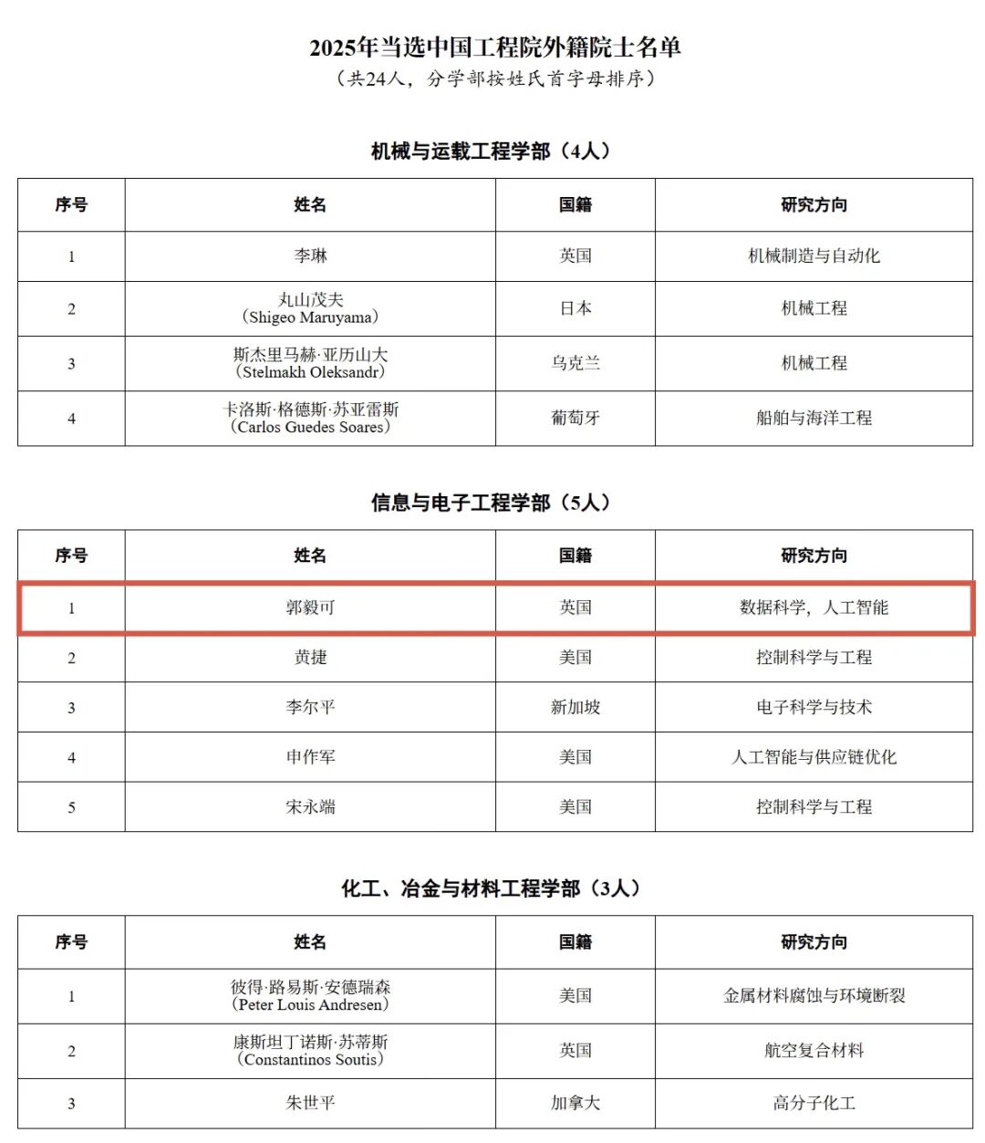 11月21日,中国工程院官网公布了2025年外籍院士增选结果,共有24人当选,