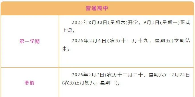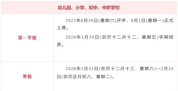 第一学期:2025年9月1日(农历七月初十,星期一)秋季开学,正式上课,2026年2月6日(农历腊月十九,星期五)学期结束。本学期教学时间(包括集体教育活动和复习考试时间)为22周。2026年2月7日(农历腊月二十,星期六)至2月25日(农历正月初九,星期三)寒假。