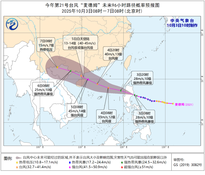 未来台风麦德姆会稳定向西偏北方向移动。今天(10月3日)白天穿过菲律宾吕宋岛,今晚进入南海。在登陆华南之前,强度可达强台风级。5日将会登陆海南或广东西南部,大概率在海南文昌-广东雷州之间区域,预估登陆强度40-45米/秒(台风-强台风级)。