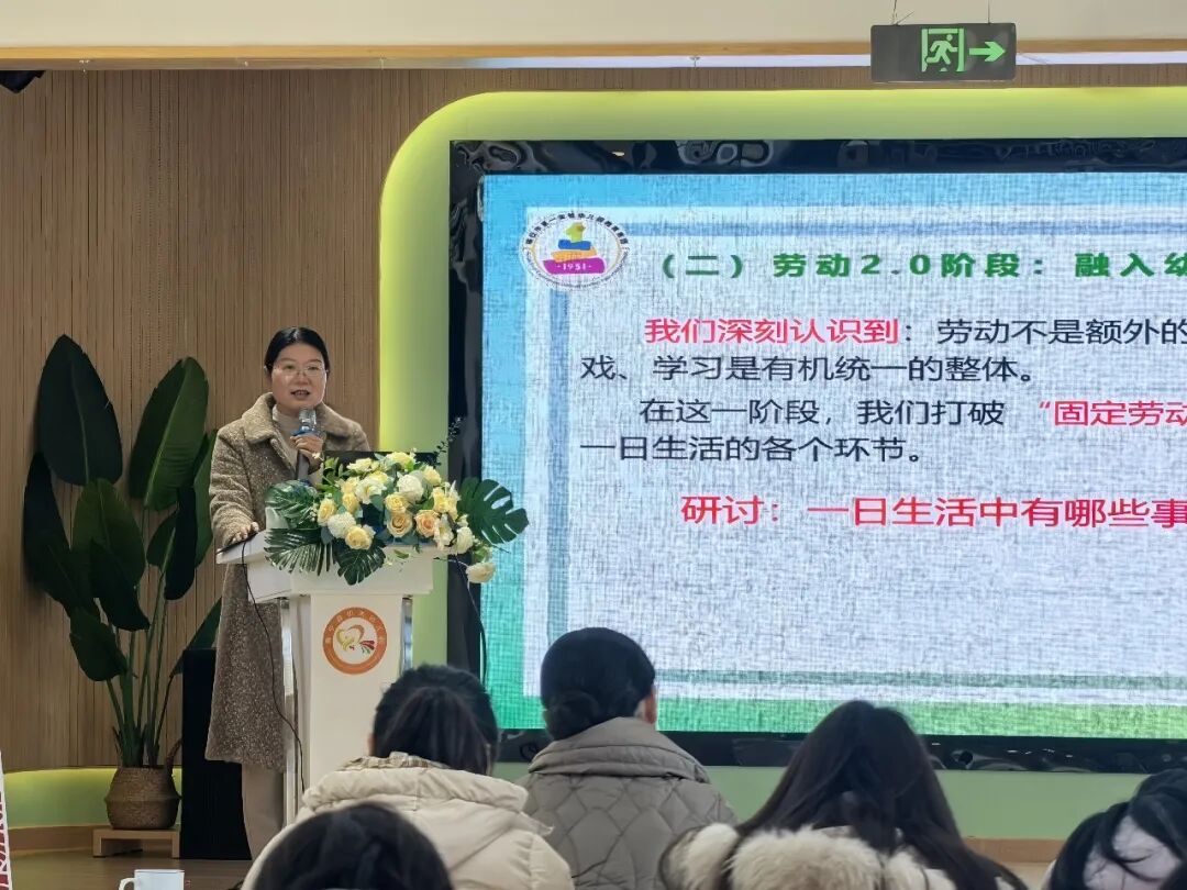 福安市实幼教育集团城阳园全秀春园长开展《打造劳动实践乐园,赋能幼儿全面发展》的讲座,从劳动教育的价值与实施路径出发,分享城阳园劳动教育历经“基础劳动、融入一日生活、跨学科‘劳动+’”三阶段迭代升级,通过时间保障、环境打造、工具适配、课程构建及家园社协同等全方位路径,推动劳动教育落地,助力幼儿全面发展。