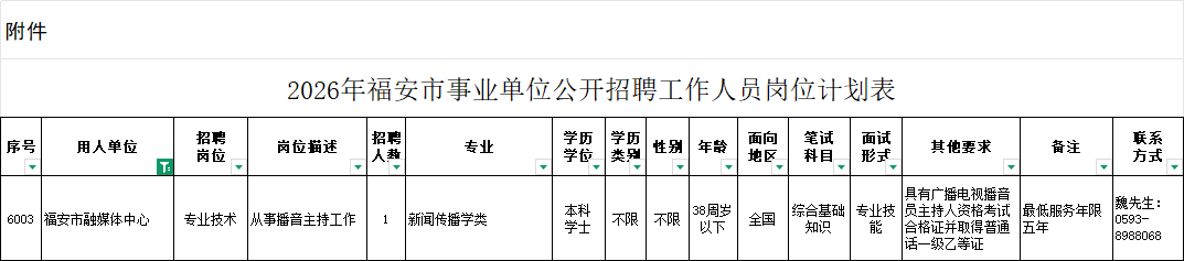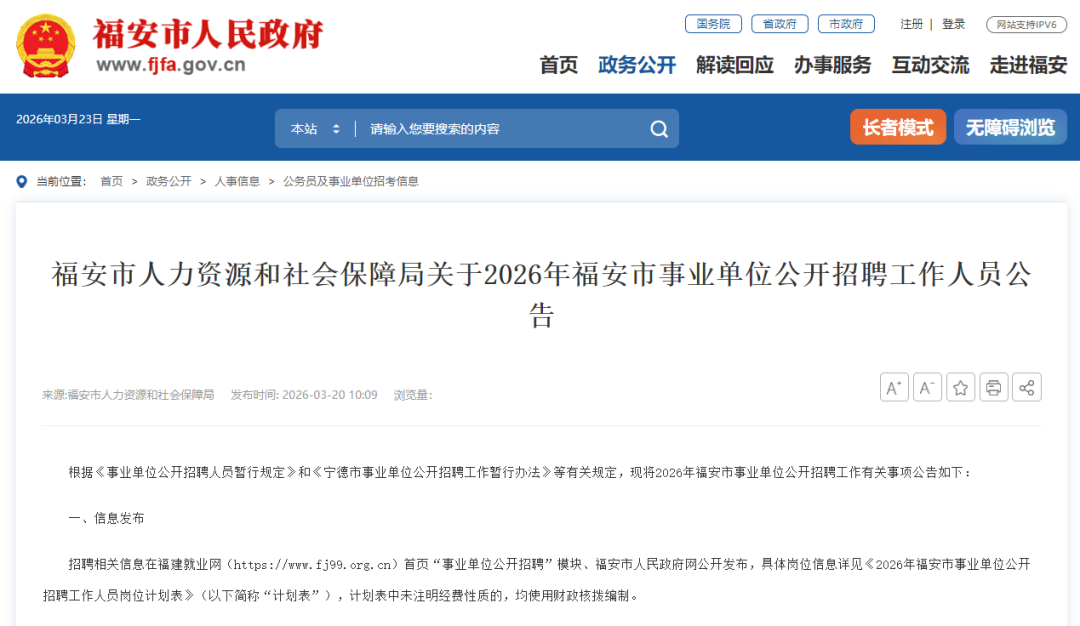 日前,福安市人力资源和社会保障局核准2026年福安市事业单位公开招聘工作人员计划共计109名。招聘相关信息在福建就业网(https://www.fj99.org.cn)首页“事业单位公开招聘”模块、福安市人民政府网公开发布。