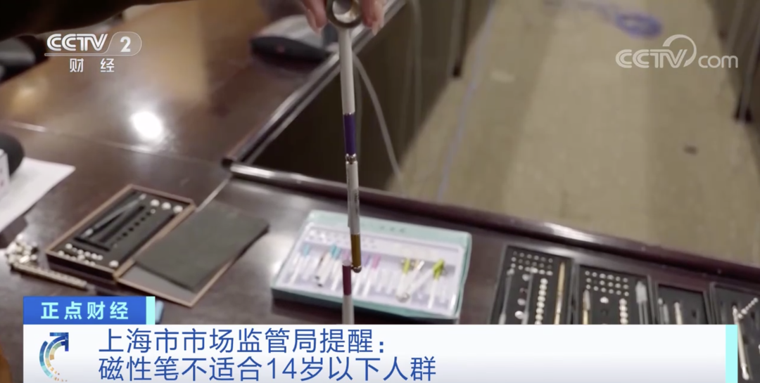 上海市场监管部门发布风险监测通报,由于磁性笔存在较多安全隐患,不适合14岁以下儿童及中小学生使用。上海市市场监管局此次风险监测网购的磁性笔,一共分为三类,一类是百变的磁性笔,第二类是塑料的转转笔,第三类就是磁性钢笔。它们都有一个共同的特点,就是依靠磁性非常强的磁力珠来变换造型。上海市市场监管局采购的样品涉及16批次磁性笔产品,专家评估认为,参考玩具产品强制性国家标准的规定,磁性笔普遍存在高磁通量的磁性小零件,不应提供给14岁以下的儿童及中小学生使用。上海市质量监督检验技术研究院高级工程师 陈静茹:如果小朋友连续几颗吞入肠道内,在肠道内相互相吸,就可能造成肠穿孔、肠阻塞的情况。上海市场监管部门提醒,家长可以进行简单测试,如果两个磁体间隔着3张打印纸还能相吸,表明磁通量已经过高,应尽量避免给孩子购买磁通量过高的磁性笔。上海市市场监管局产品质量安全监管处副处长 周佳:从检测中发现的这些安全风险问题,我们第一时间通报了样品采集平台,要求他们采取相应的措施控制风险。另外,我们将过程当中发现的这些违法行为,通报了生产者和销售者属地的市场监管部门,进行调查和处理。