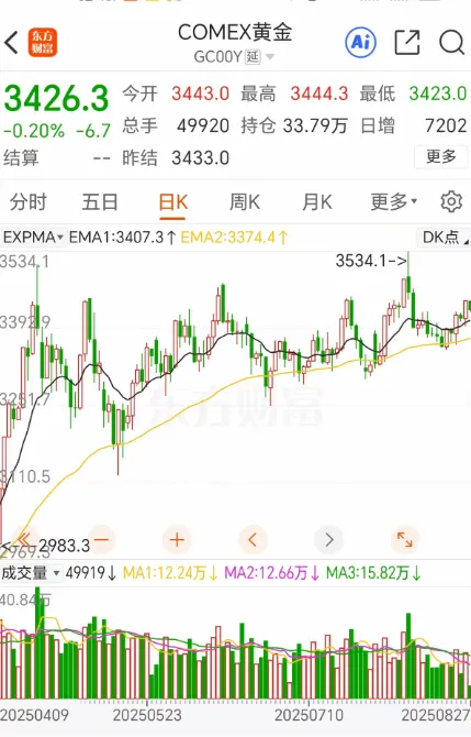 今天(8月27日)盘中,COMEX黄金一度冲至3444点,创近期新高。