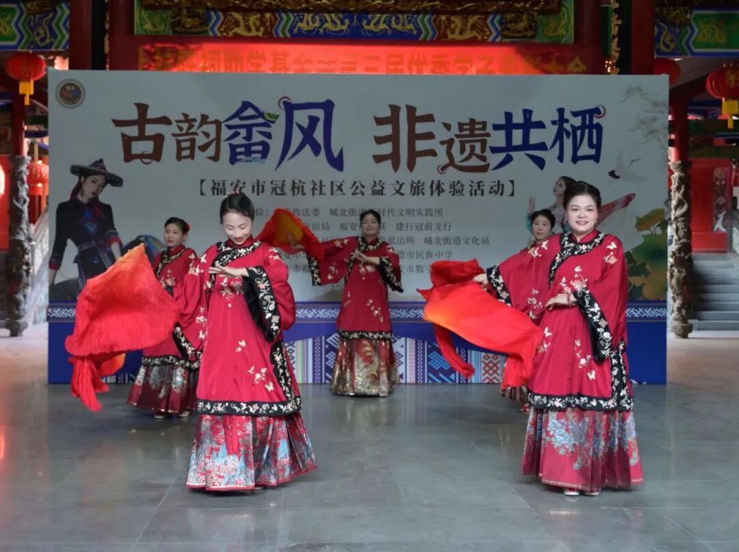 12月27日,冠杭社区内欢声笑语、文化流彩,一场以“古韵畲风 非遗共栖”为主题的志愿服务活动热烈展开。活动由多方联合举办,福安市禁毒委员会办公室、宁德市民族中学、城北街道派出所等单位志愿者共同参与,为社区居民呈现了一场融合非遗体验、技艺传承与民族团结的文化盛宴。