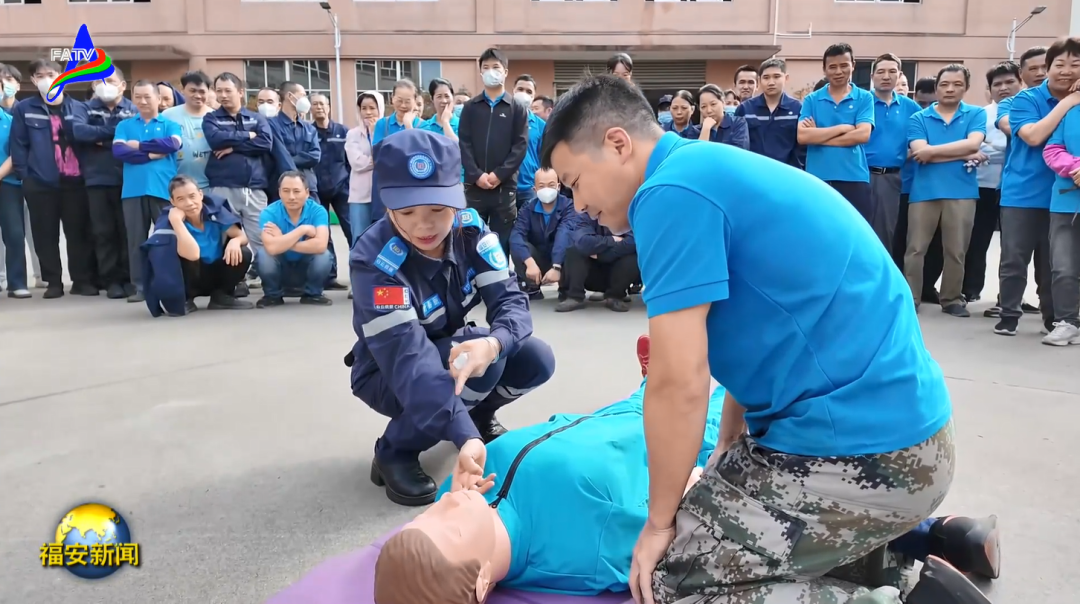 演练模拟生产车间失火,警报响起后,工人们在消防人员引导下,弯腰低姿,沿预设路线有序撤离至安全区域。随后,消防人员结合企业特点,讲解示范灭火器的“提、拔、握、压”操作,并指导工人分组实操,掌握灭火技能。白云应急救援队队员与闽东医院医护人员也接力授课,针对工业机械擦伤、意外晕厥等场景,通过案例和模拟演示传授心肺复苏、海姆立克急救知识,提升工人们的应急救护技能。