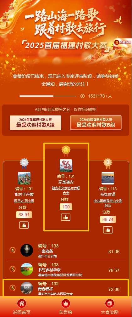 2025首届福建村歌大赛网络投票已于12月4日晚揭晓,由福安市文联选送的原创歌曲《家是福安》以超高人气势头,荣获“最受欢迎村歌”网络投票第一名。同时,另一首福安原创作品《青春模样》也凭借清新动人的旋律,成功跻身榜单第六名。双曲入榜,成绩亮眼,展现了福安文艺创作的旺盛活力与深厚群众基础。
