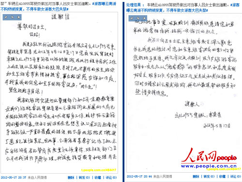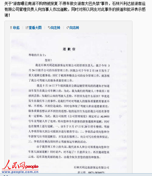 | 名为“处理结果”的非认证用户同时还通过人民微博发布了石林兴利达旅游客运有限公司管理负责人向当事人作出的道歉(人民网截图) |