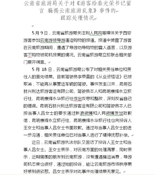 5月11日,云南省委书记秦光荣做出批示:“请省旅游局重视处理此件投诉”。